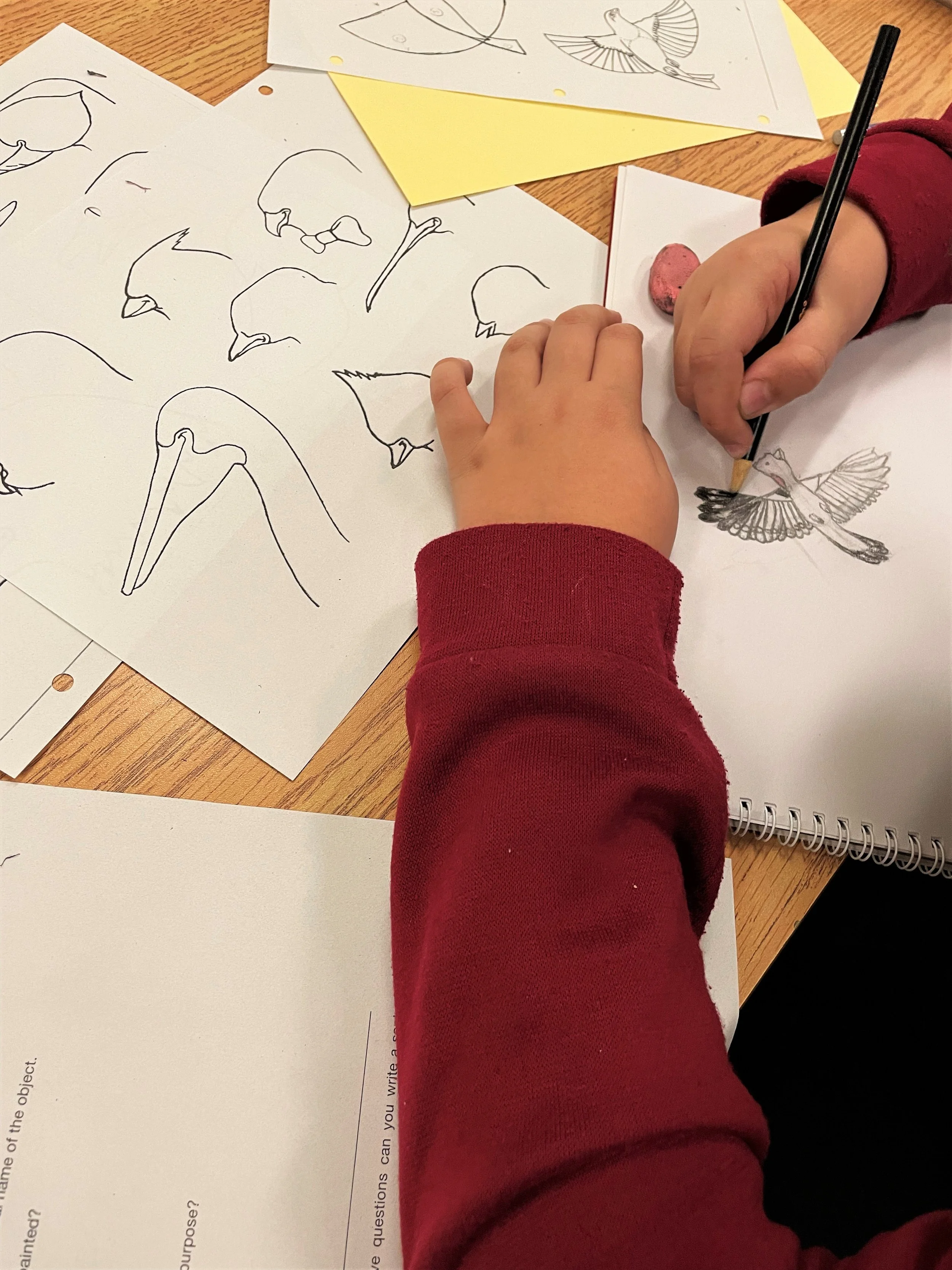 Student process using many forms of inspiration to prompt inquiry into their own drawing.